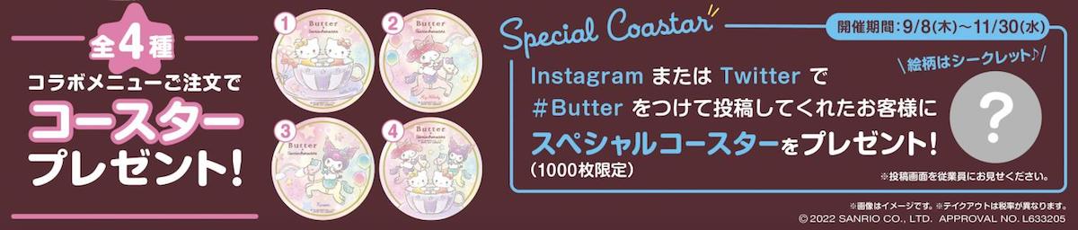 さらに、SNSで#Butterをつけてコラボ商品を投稿した方には1000枚限定、絵柄はシークレットの「スペシャルコースター」をプレゼントする企画も開催中!この機会にぜひ近くのお店まで足を運んでみてくださいね。