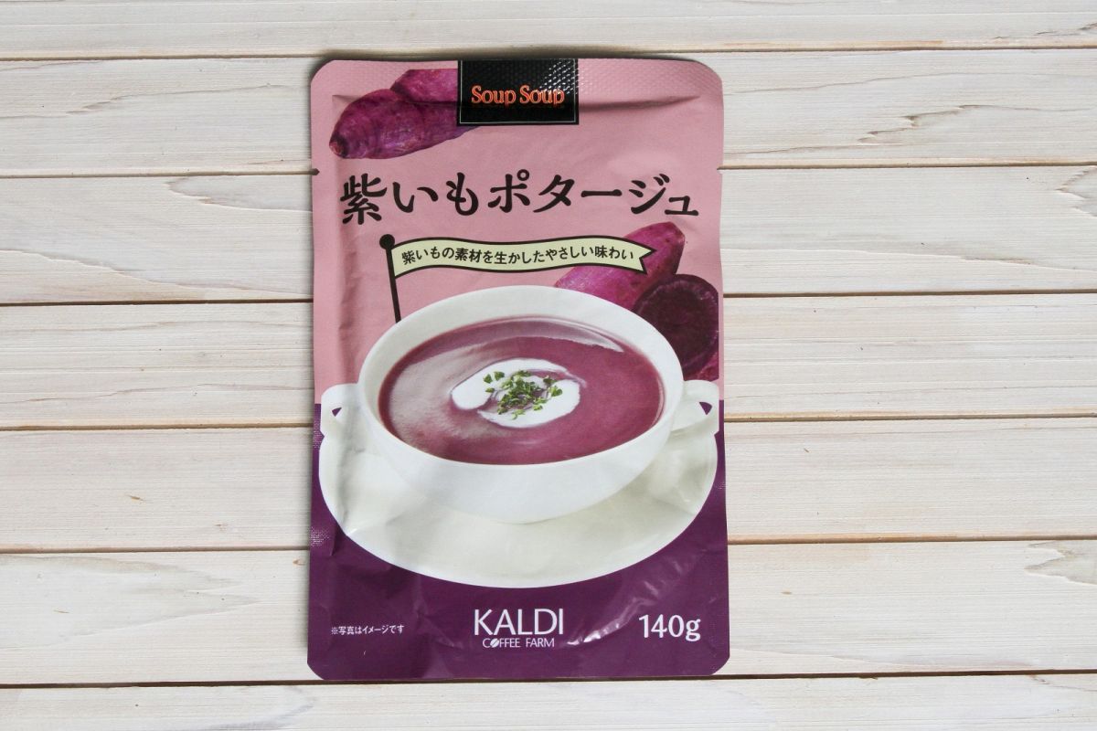 「Soup Soup 紫いもポタージュ(140g)」206円。紫いもはさつまいもの一種で、中まで紫色の品種のこと。パッケージは紫色とピンクの2色使いで、「紫いもの素材を生かしたやさしい味わい」と書かれています。でも、紫いもそのものって、あまり食べたことがないので、どんな味なのか想像がつきません。