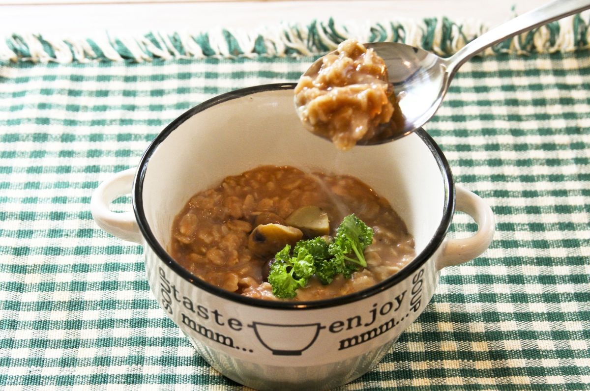 作り方は、カップにオートミール(大さじ2〜3杯)を入れ、スープを注ぎ入れます。あとは電子レンジで2〜3分、加熱すればできあがり。 オートミールはスープを吸うとかさを増すので、カップは大きめのものを使用しましょう。