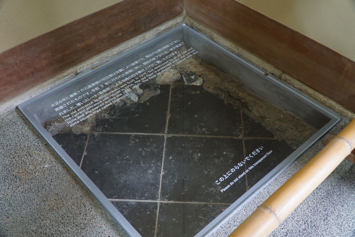 「臨春閣」の入口には、今回の耐震補強工事のために玄関棟内部の堀削をした際、発見された戦前の床面遺構が展示されています。昭和 30 年代の修理では⽞関棟は新築されたという記録しか残っていなかったため、戦前の物はすべて失われていたと思われていました。しかし、今回の工事で図らずも残されていたことが分かり世紀の大発見となりました。また、今回の調査で、床面に使用されているのは東京駅の屋根にも使われている「スレート」という素材だということも判明したそうです。