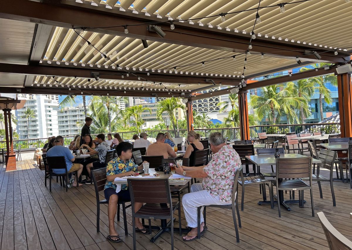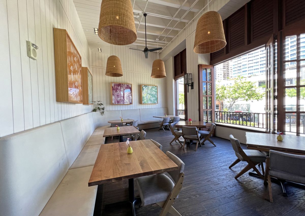 カラカウア大通りに面したエリアは、広いスペースにテーブルが6つのみと、なんとも広々として贅沢な空間の使い方です。こんなにおしゃれなのに、お店の雰囲気はリゾートカジュアルなので、肩肘を張らずに食事を楽しめるのがうれしいですね。