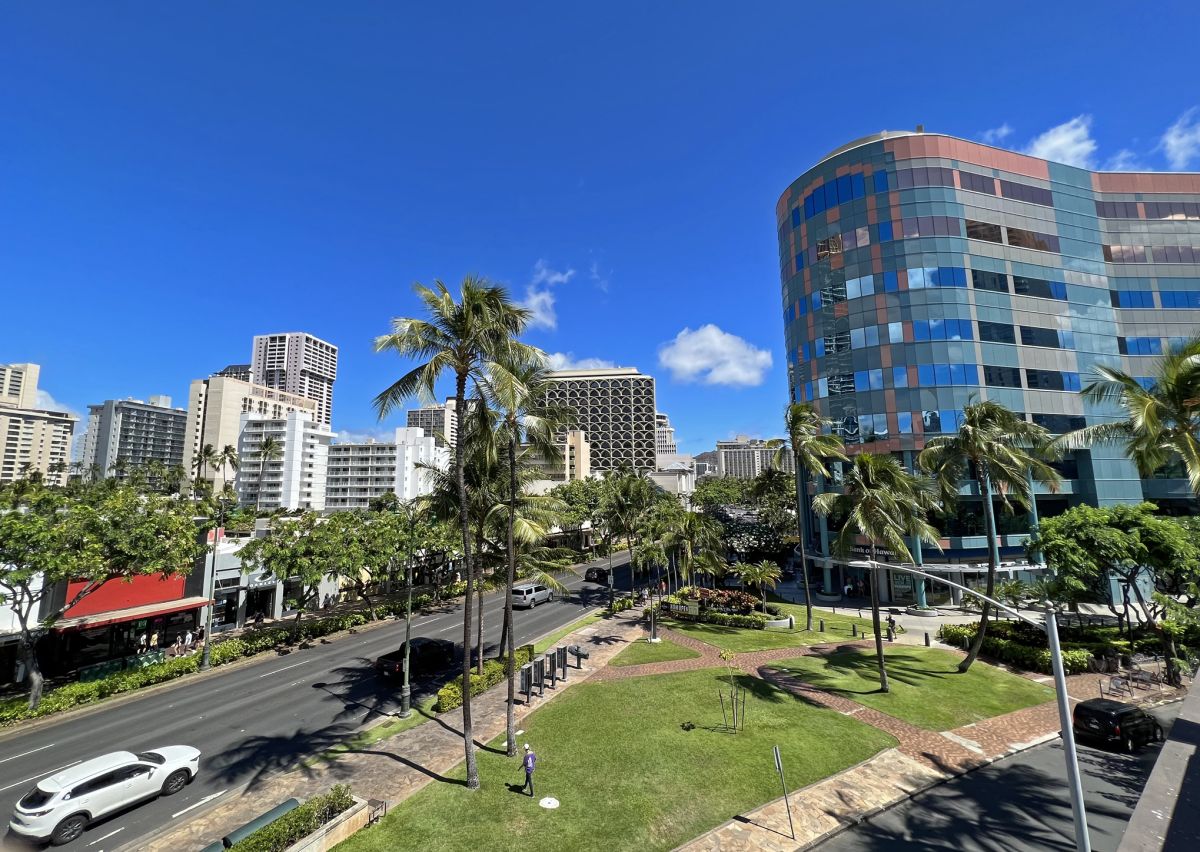 ルーフトップからの眺めはこの通り。オーシャンビューもいいけれど、カラカウア大通りのシティビューもオツですよね。のんびりとした街の様子を眺めながら、おいしいドリンクを片手に話も弾みます。