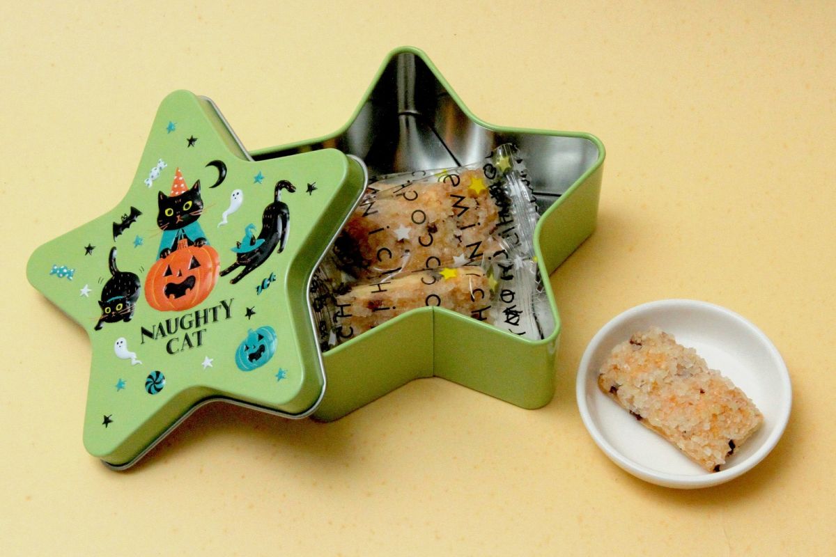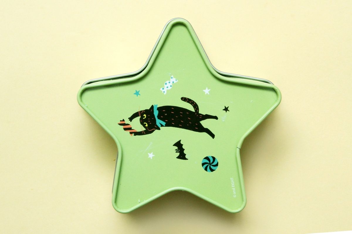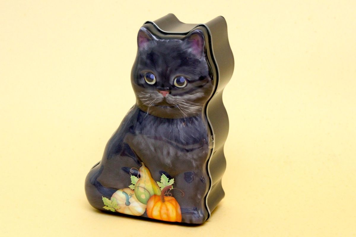 星型の缶に、ハロウィンの黒猫やカボチャのランタンが描かれたキュートなデザインで、食べ終わったあとは小物入れとして、平置きにしても、縦置きにしても使えます。