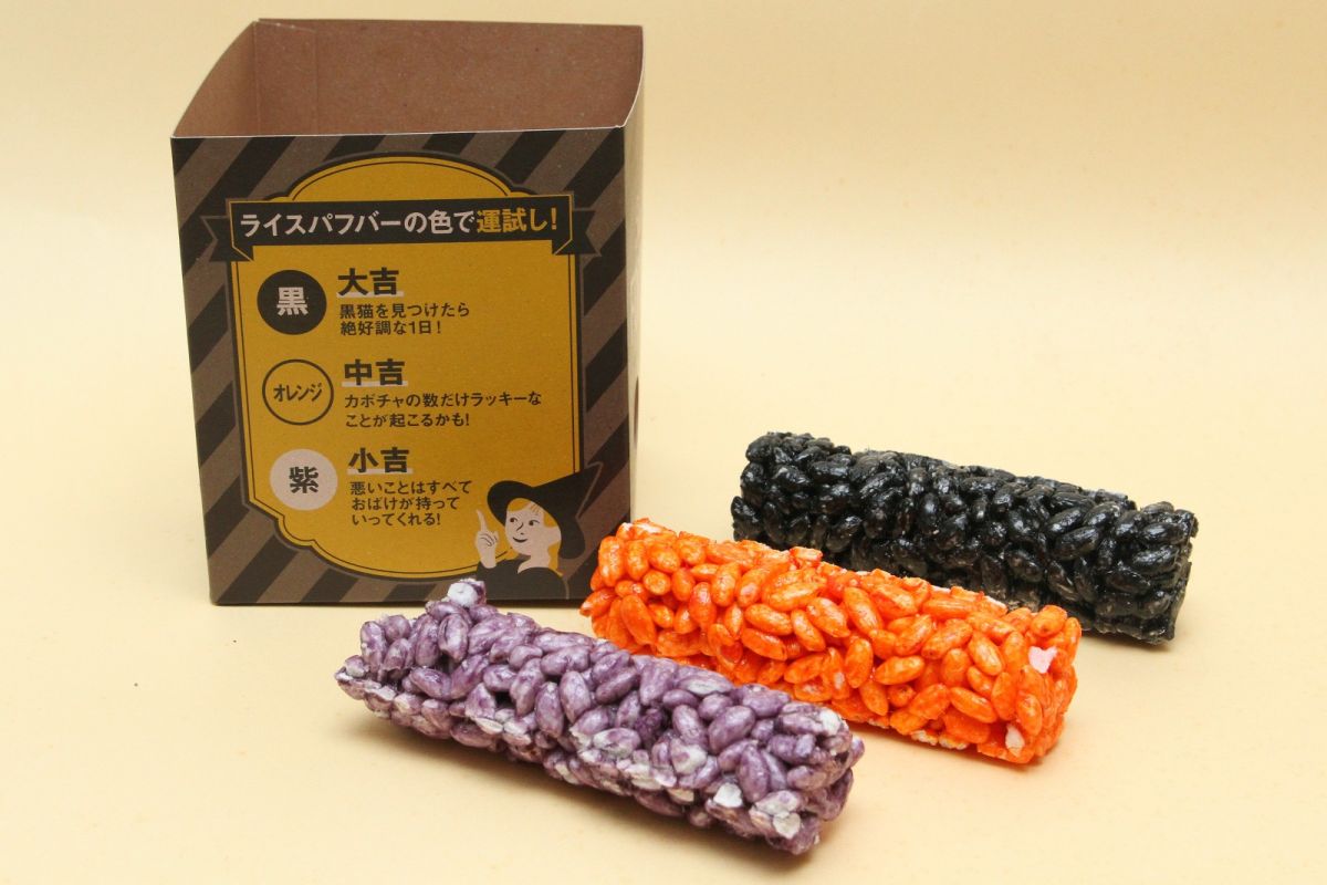 おみくじのように引いた箱の中から出てくるライスパフバーの色で、運試しします。