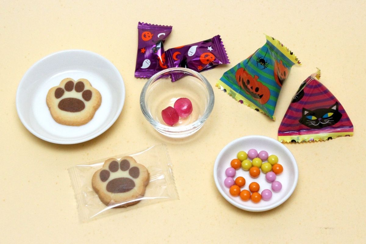 「ハロウィンネコシェイプ缶」の中には、小さなチョコボールの入ったテトラ型パック2個と、ネコの肉球をデザインしたクッキー2枚、グレープフルーツ味のキャンディ5個が入っています。