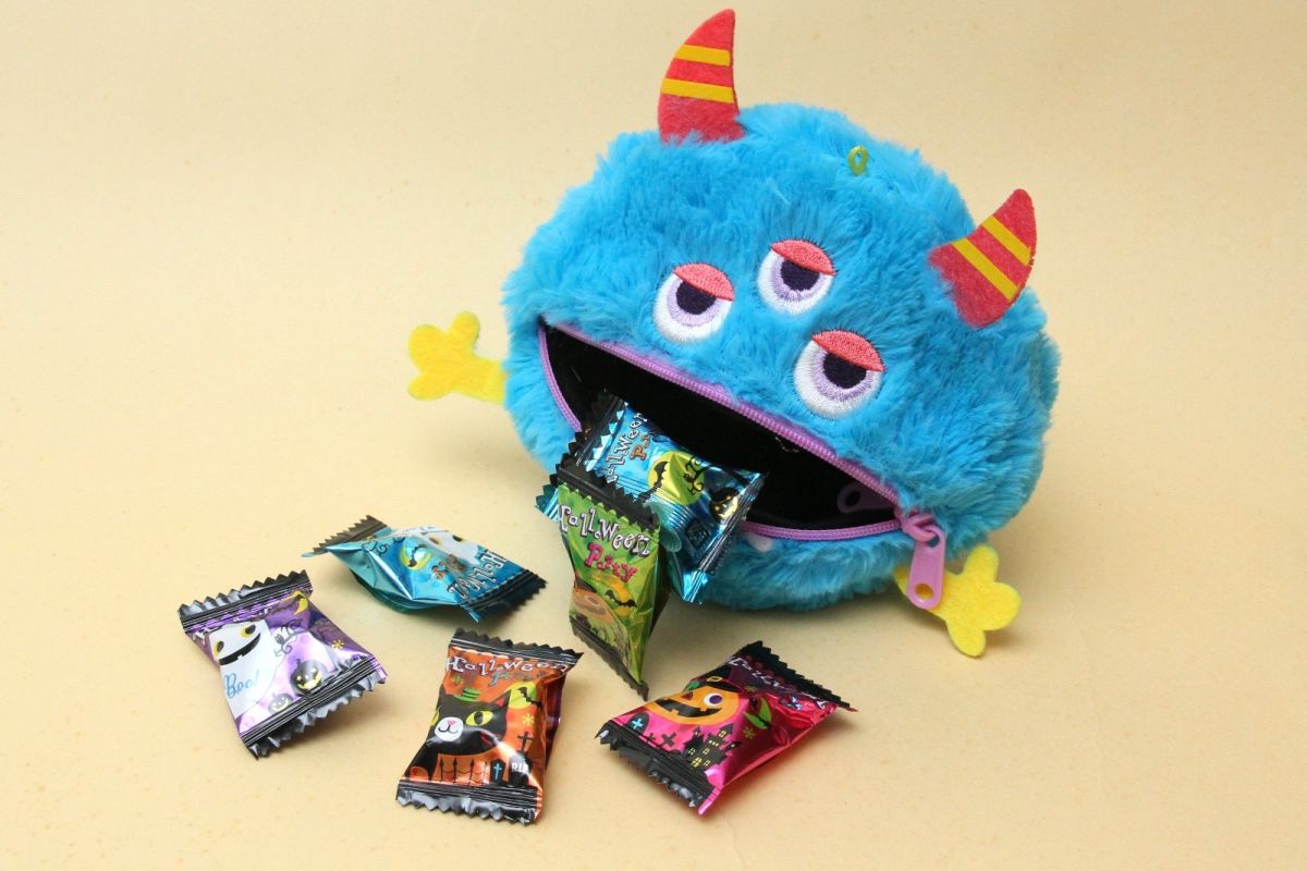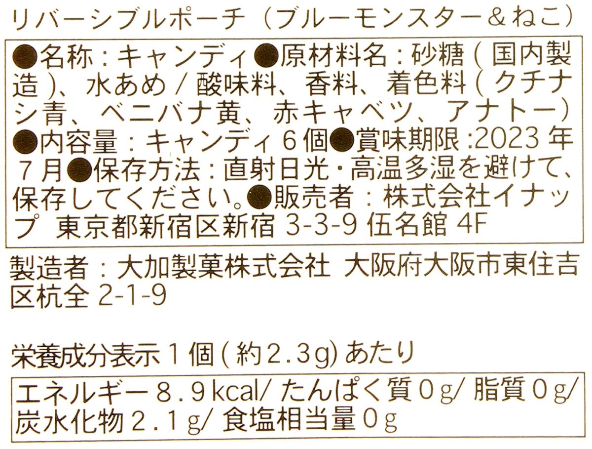 ポーチとなっている黒猫の顔の直径は約14㎝。裏側にファスナーが付いていて、中にはキャンディが6個入っています。キャンディのパッケージにも黒猫やカボチャ、お化けの絵柄がデザインされていて、ハロウィン気分が満喫できます。