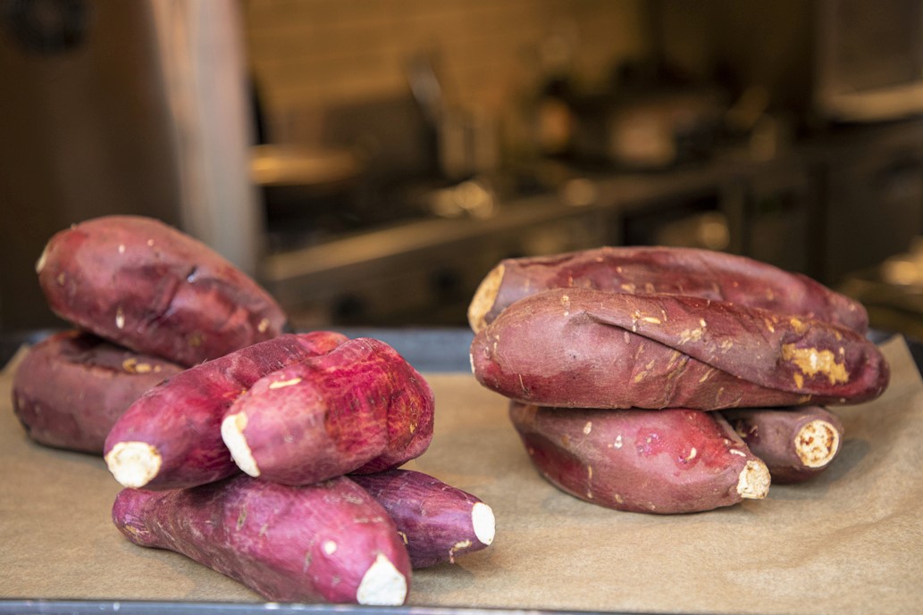 鹿児島・種子島など10府県下の提携農家さんと、土からこだわって共同栽培するサツマイモは、味の濃さや栄養価が段違いとのこと。形や重さもさまざまなゴロリとしたサツマイモは、時期や旬によって3~4種を入れ替わりで使用。この日は、紅はるか、鳴門金時、シルクスイートがスタンバイしていました。