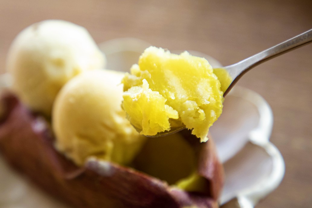 気温が高い季節(期間は未定)には、冷やしたサツマイモも使用しているとのことです。スプーンですくっただけで「おいしそう!」と思ってしまうねっとり感がたまりません。口の中に入れると、とろける食感にうっとり。冷たいことで甘さがシャープに際立ち、お芋の風味がしっかりとしたアイスとの相性もバッチリです。皮までおいしく食べられます。