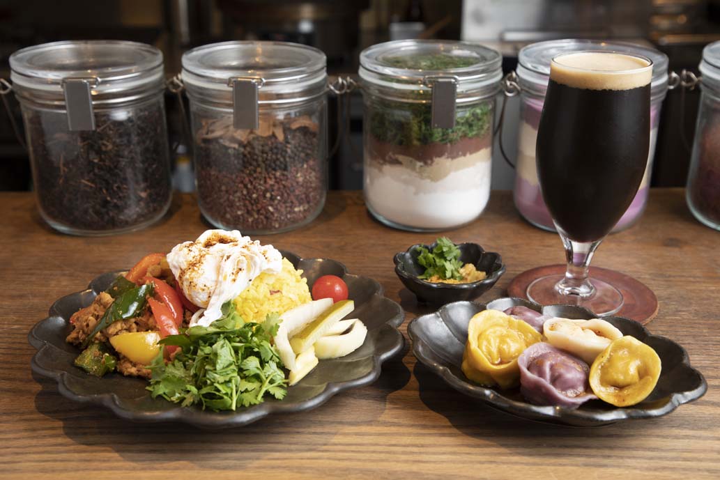 「ハマノガパオ」には、サイコロサイズのサツマイモがゴロゴロと入るターメリックライスのサイドに、芋蜜を隠し味にしたスパイシーなミンチがたっぷり。さりげないながら確かに感じられるお芋の食感と甘さが絶妙で、エスニックな味わいを引き立てます。