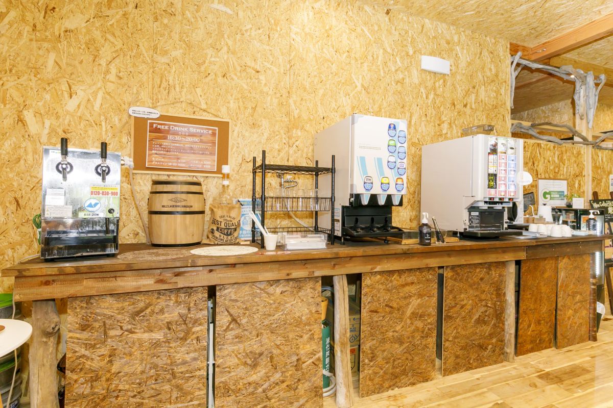 チェックイン後は管理棟内にあるフリードリンクで乾杯を。なんと16時30分~20時まで、生ビールやワイン、ソフトドリンクなどが飲み放題なんです!