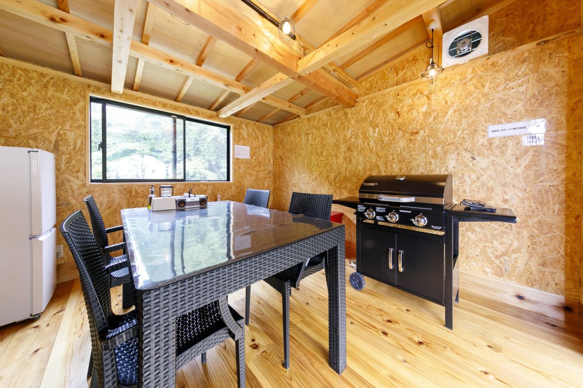 テント横には野外BBQスペースとBBQ棟を完備。就寝スペースと食事スペースが分かれているので快適です。BBQ棟には冷蔵庫、BBQグリル、食器、スピーカーなどの設備が揃います。キャンプのような開放感あるアウトドアを楽しめるのもグランピングの醍醐味です。