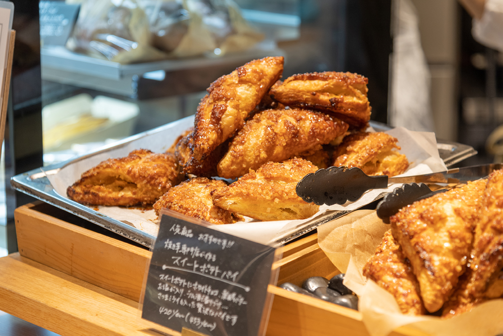 豪快に割ってかぶりつくのもおすすめ。さつまミライのしっとり感と、パイと表面のザラメの食感のコラボレーションが楽しい!パイの香ばしさが、芋そのものの甘さをさらに際立たせます。