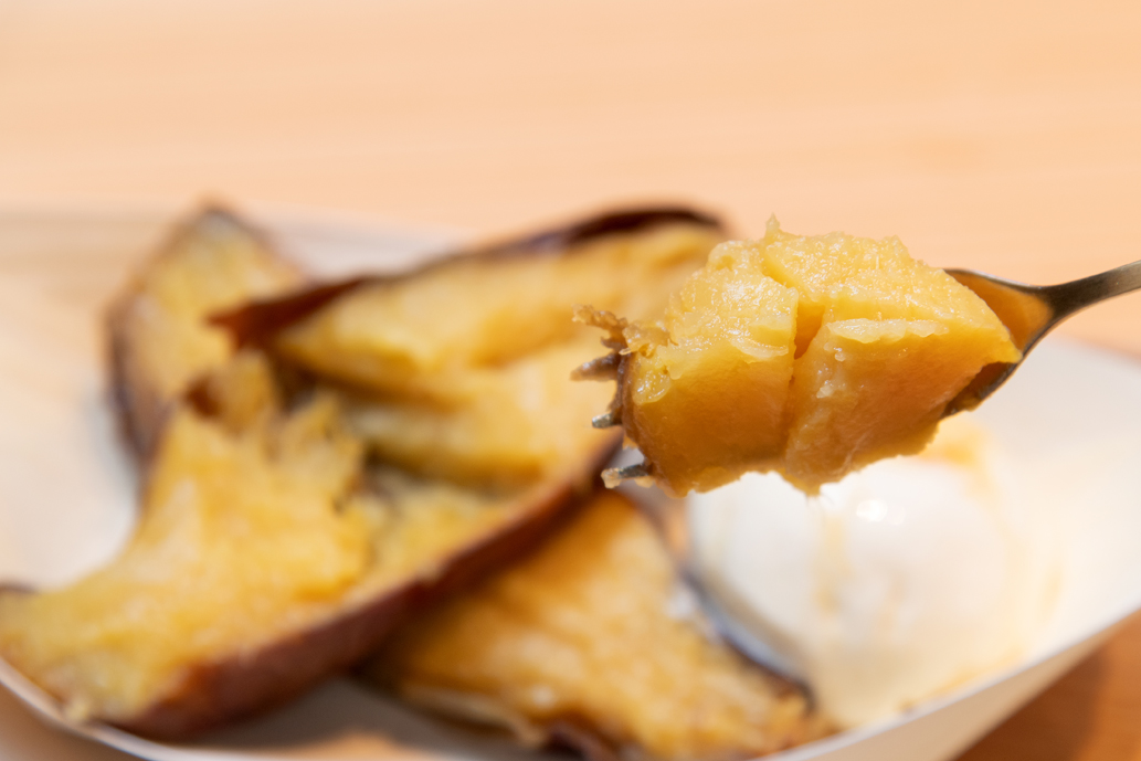 ひと口ほうばってみると、ハチミツほどとも言われる甘さと、コク、そして、しっとりとした食感に感動!焼いただけとは思えない味わいです。皮の近くはより甘く、自然の芋感も堪能できるので皮も必食です!