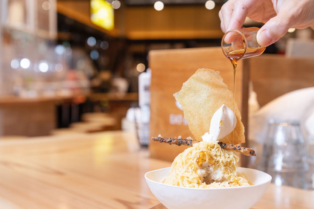 こちらはサツマイモづくしのモンブランパフェ。甘い香り漂うサツマイモペーストのうえには、芋せんべい、芋のメレンゲ、さらに中には焼き芋のアイスも!
