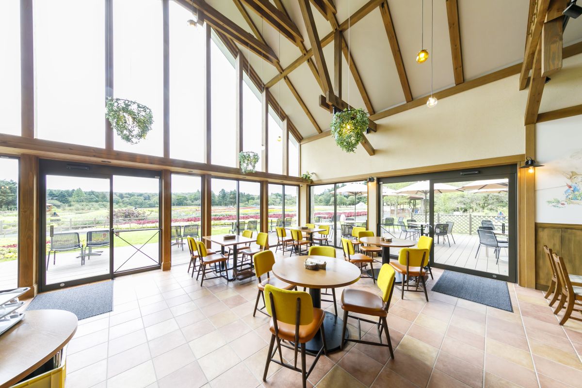 ザ ガーデンのさらに奥へ歩いていくと、大きな窓ガラスにテラスつきの建物「ザ カフェ」があります。花畑やイングリッシュガーデンの雰囲気をそのままにした英国風のカフェは、ピーターラビット™の世界観と上品で本格的な料理やスイーツ、ドリンクが楽しめます。