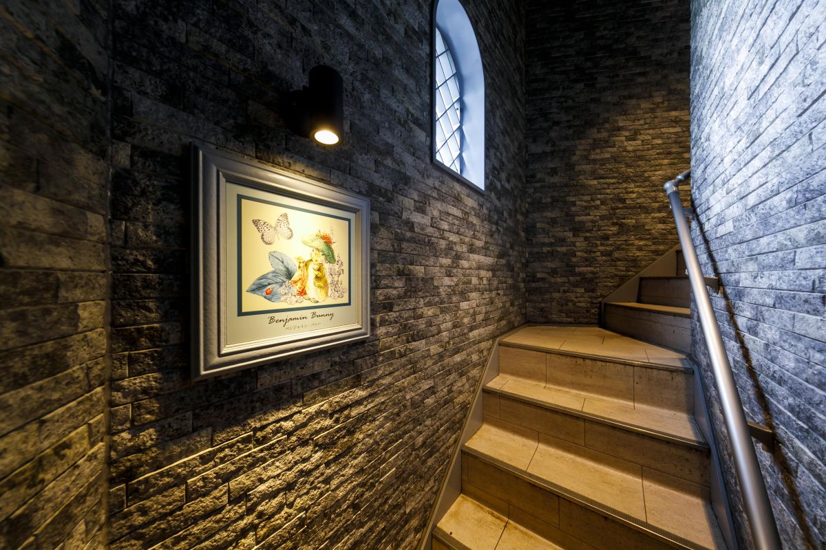 階段を上っていくと、壁面にはいくつかのキャラクターフレームがあり、素敵なギャラリー空間といった雰囲気。小窓から外の景色も楽しめて、まるでお城の中にいるようです。