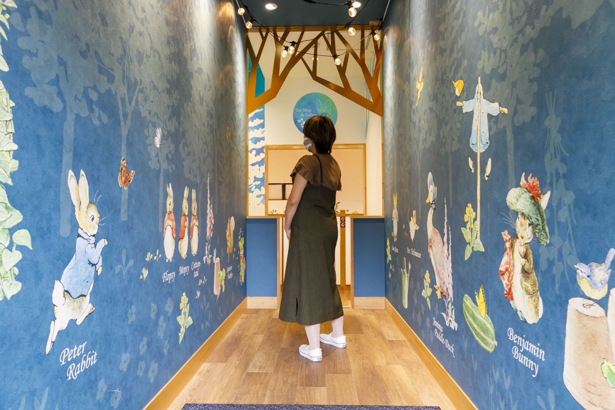 ザ タワーの上りとは反対側の階段を降りていくと、目に飛び込んできたのは、ブルーの壁面に描かれたキャラクターたち。ピーターラビット™の絵本の世界に引き込まれたまま「ザ ショップ&ギャラリー」へと入店します。