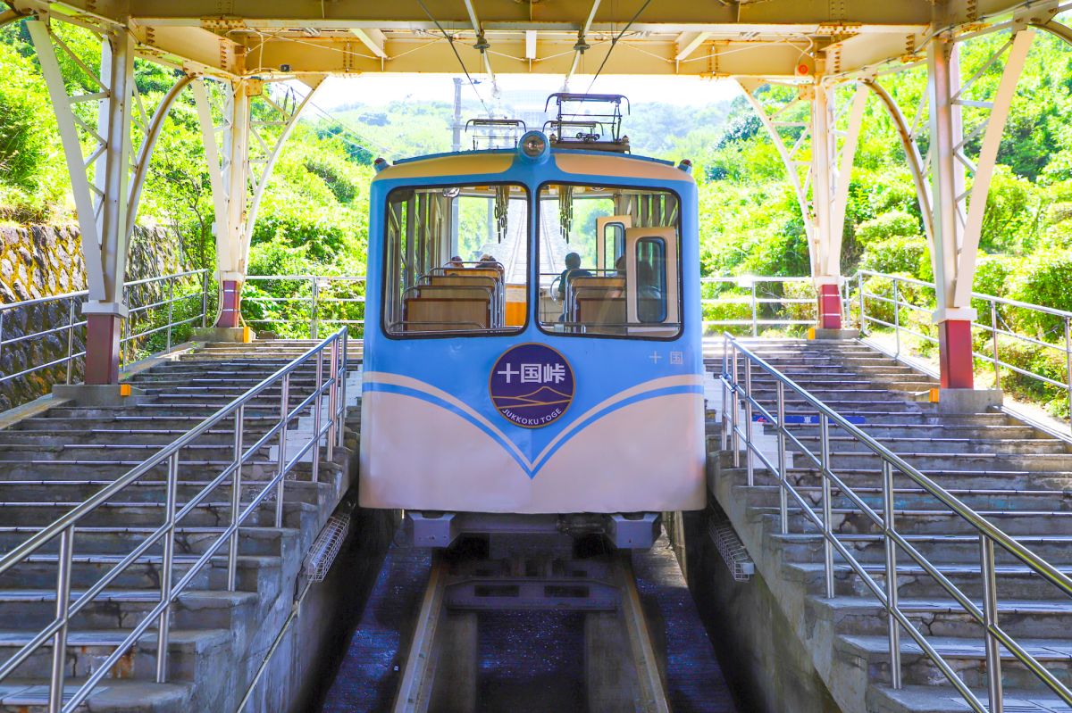 全長316m、高低差約101mを結ぶケーブルカは、十国峠を囲む山々をイメージしたアクアグリーンの「十国号」と、青空を思わせるスカイブルーの「日金号」(写真)の2両体制です。