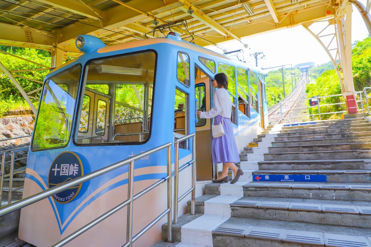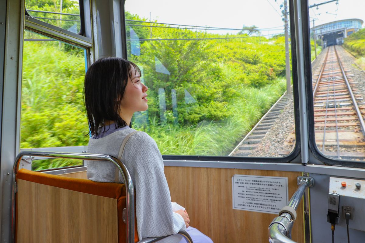 全長316m、高低差約101mを結ぶケーブルカーの車内は段差状になっており、どの座席からも窓の外を楽しめます。一番人気の最前席は、すれ違う下りのケーブルカーもよく見えますよ。
