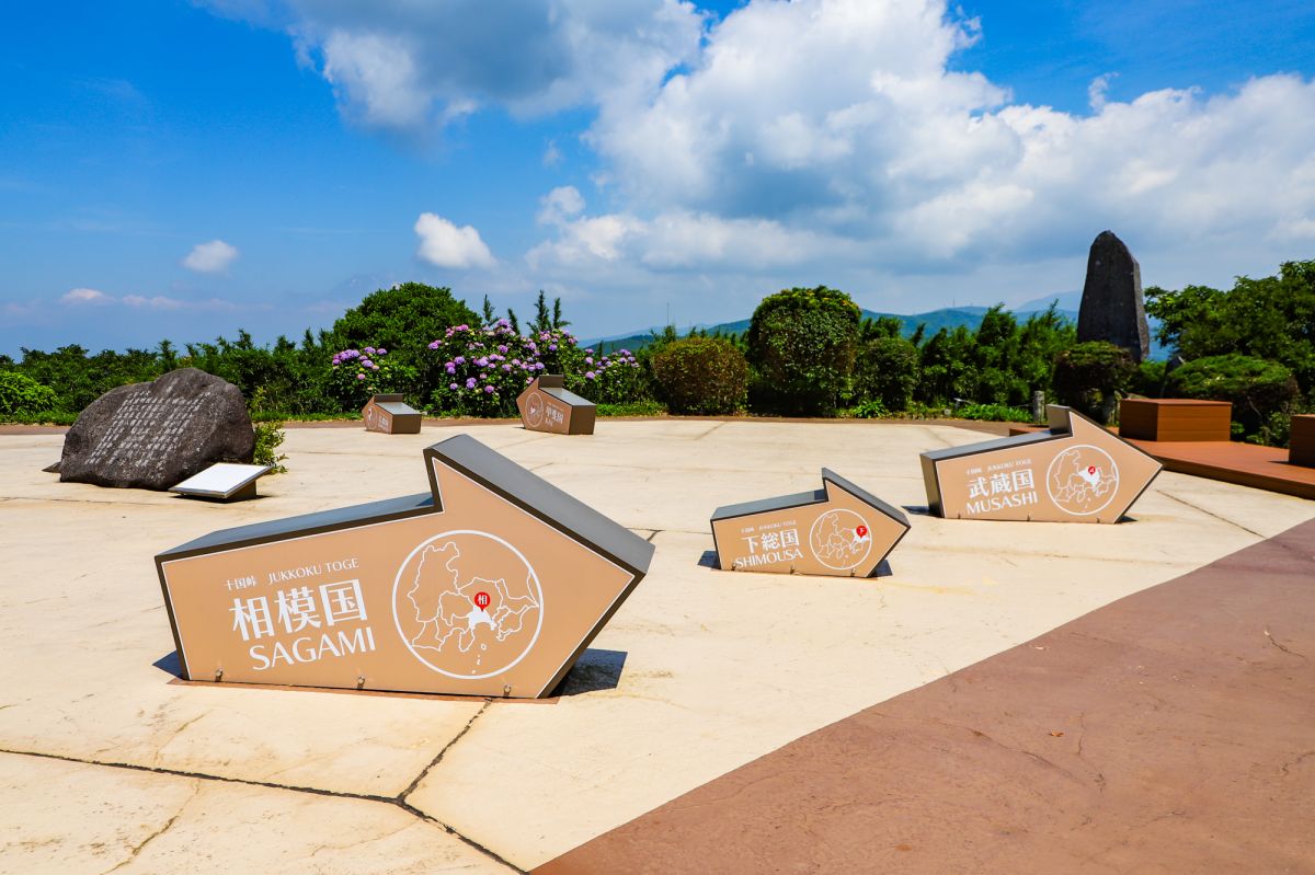 大きな矢印が示す先は、十国峠の名前の由来になった旧国名。「伊豆」「駿河」「遠江」「甲斐」「信濃」「相模」「武蔵」「上総」「下総」「安房」それぞれの方角を向いています。富士山はもちろん、愛鷹山、南アルプスなど周囲の山々を見渡すことができます。