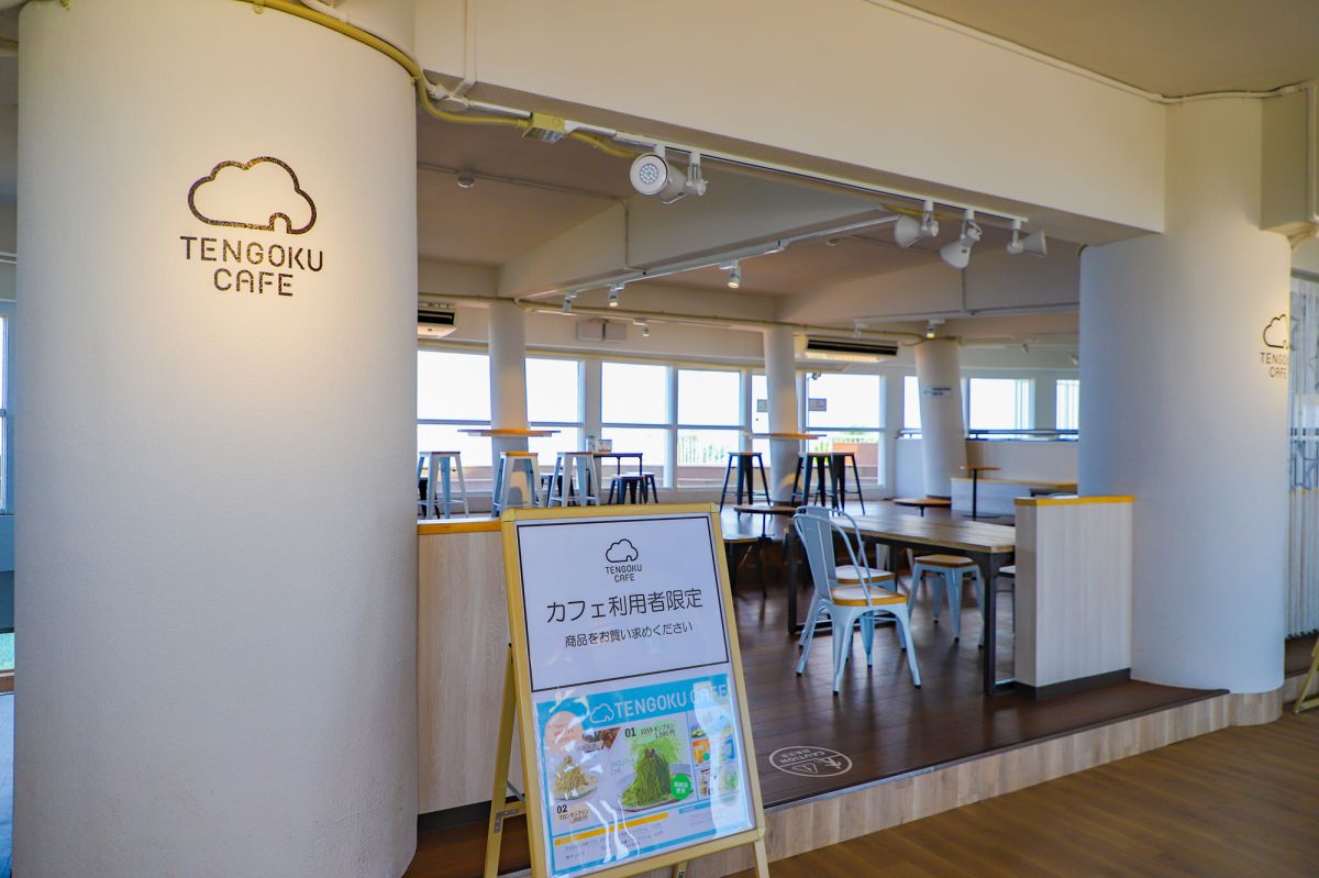テラスにあるドーム状の建物の1階には「TENGOKU CAFE(てんぐかふぇ)」があります。雲をイメージしたロゴは静岡県の形を模しており、細かいこだわりにも驚き!