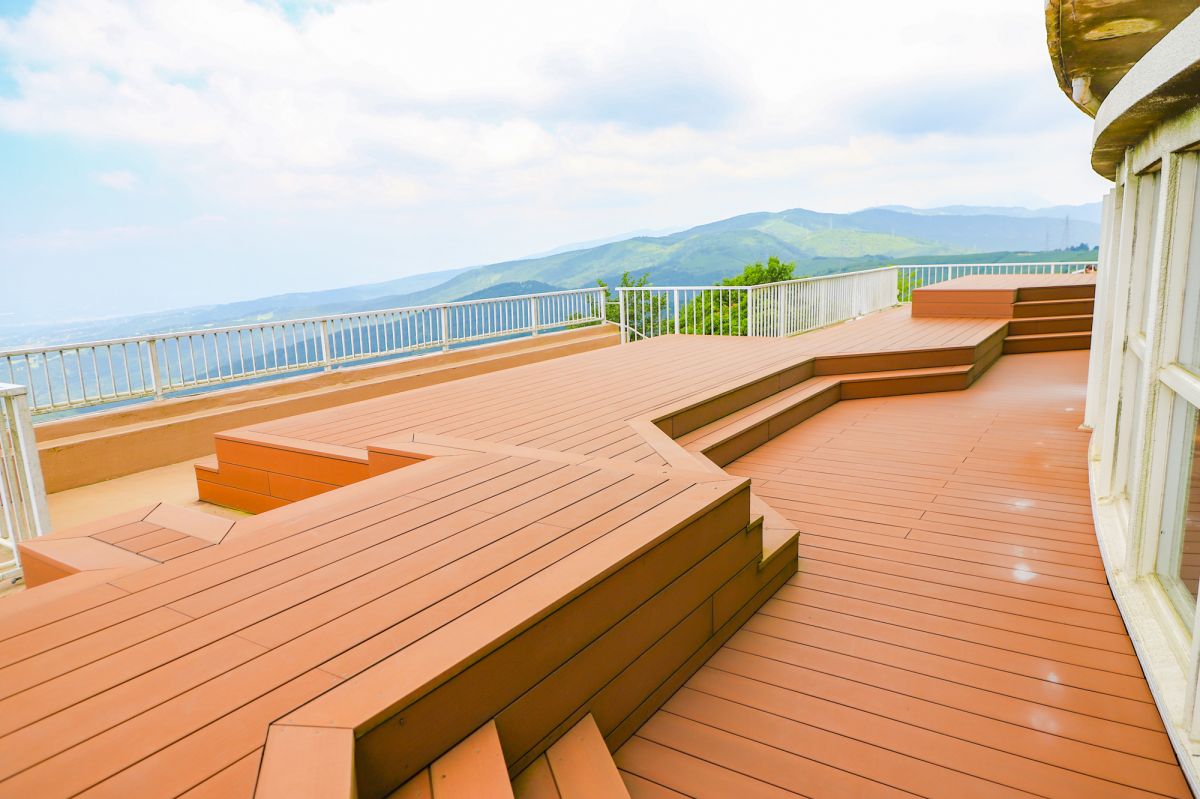 テラスに広がるのは、視界を遮るものがない360°のパノラマビュー! 山頂広場を囲むように、さまざまな形状のデッキが設置されています。