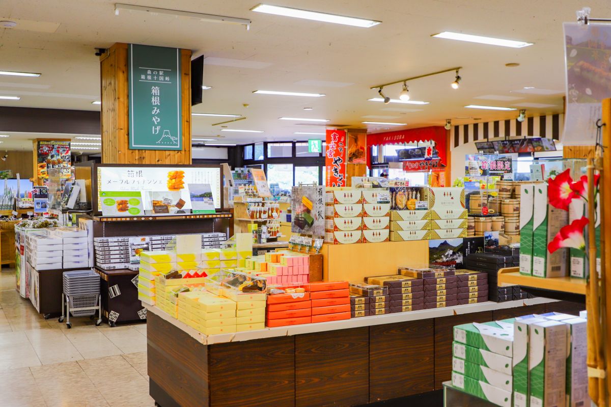 ケーブルカーで山麓駅に戻ったら、森の駅箱根十国峠1階でおみやげ選び。食品を中心に、静岡や箱根のおみやげがたくさん並んでいます。