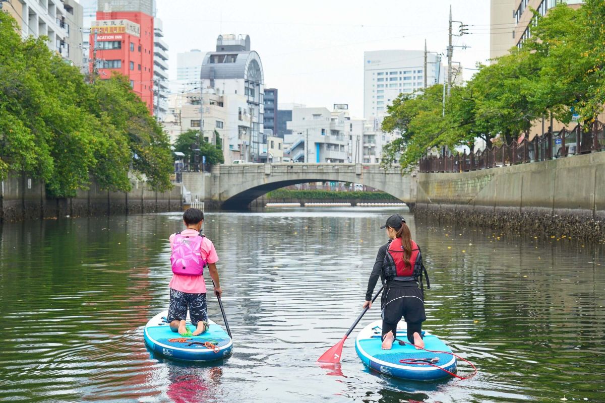 レクチャーを受けたら、早速大岡川へ。初心者の方は、最初は立ち上がらず、立てひざをついて漕いでいきます。