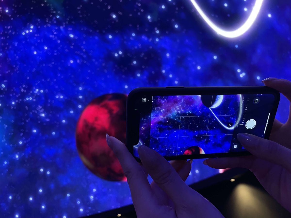 没入感たっぷりの鮮やかな映像は、写真に残しても想像以上にきれいなのが魅力。臨場感たっぷりで、本当に宇宙旅行をしているかのような気分が味わえますよ。