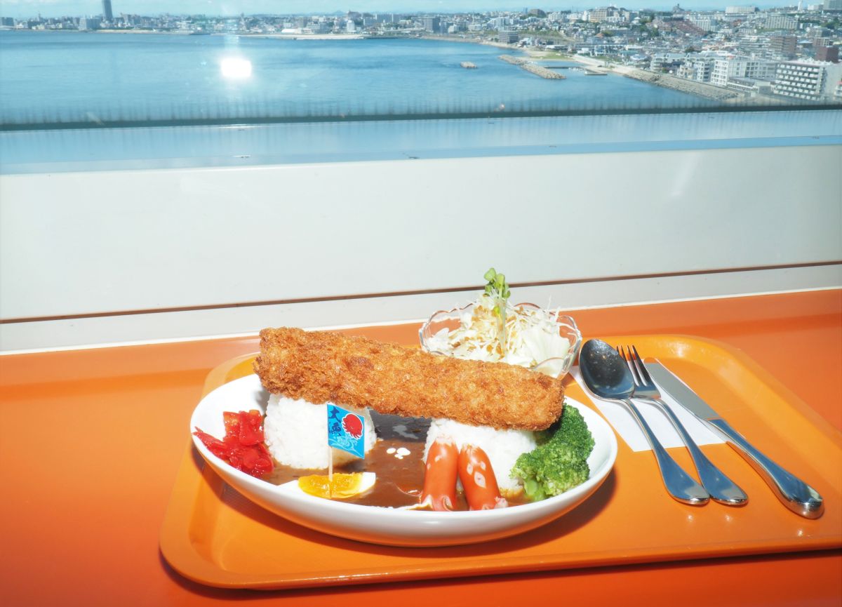数あるメニューの中でもご当地感たっぷりなのが、名物の「明石海峡大橋絶景カレー」。左右に盛られたご飯は舞子と淡路島を、その上に乗るヒレカツは明石海峡大橋をイメージ。ゆで卵の漁船やウインナーで表現された明石のタコなどもお皿を彩ります。まろやかなルゥとジューシーなヒレカツが互いを引き立て合い、食べ応えも抜群です。