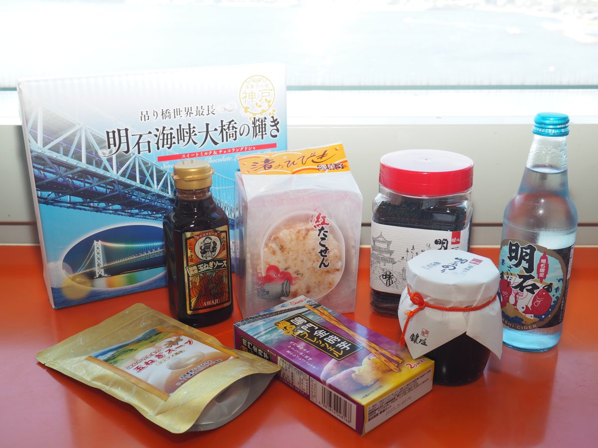 おみやげコーナーでは明石や淡路の名物が大集合。たこせんや海苔、サイダーのほか、淡路島のタマネギで作ったスープなど、幅広い商品がラインナップ!品数の多さに目移りして財布の紐が思わず緩んでしまいそう。