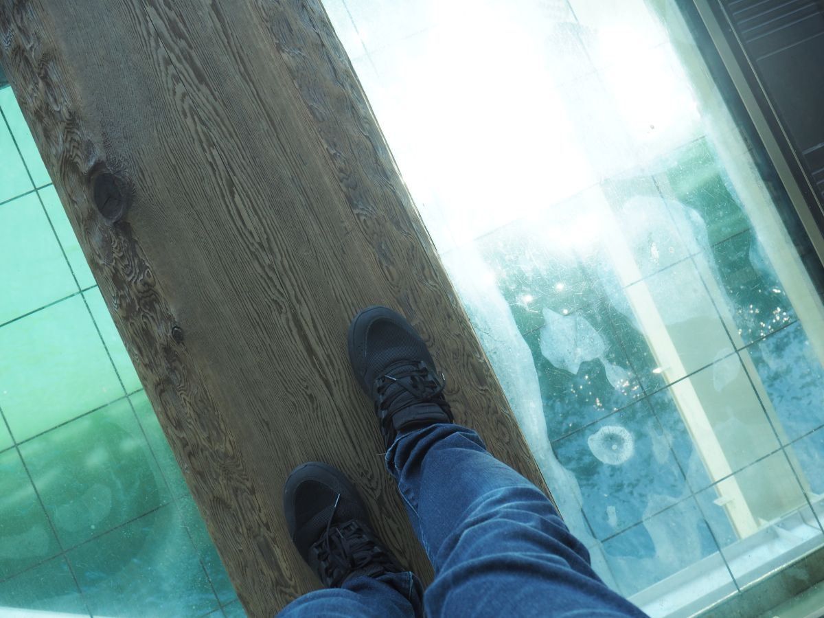 まるでSF映画の宇宙船のような通路を進むと、ガラス張りの床と丸太の橋が登場。下を覗くと高所にいることがわかりドキドキしますが、勇気を出して渡ってみましょう。