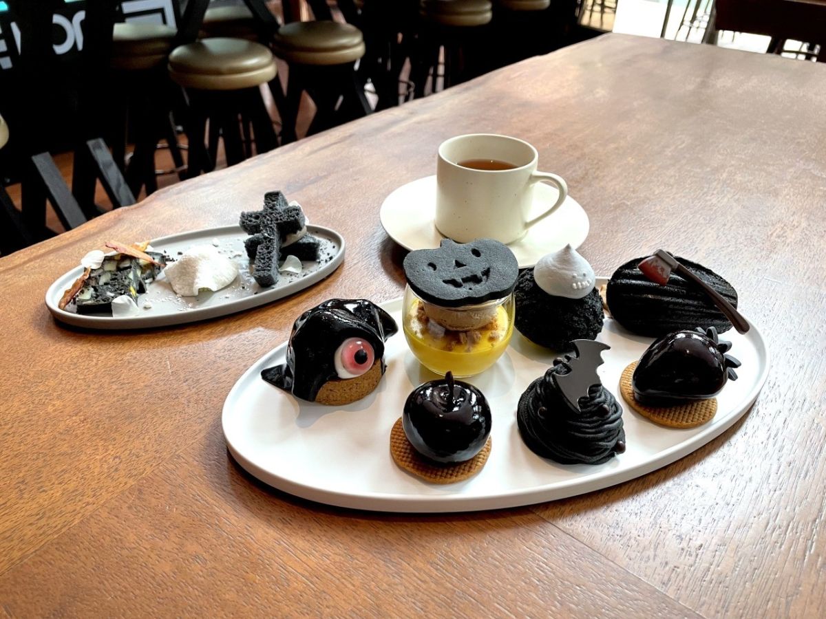 いかがでしたか? 全体的に黒っぽく、大人っぽいダークなハロウィンのイメージに仕上がっています。さらにかぼちゃのクッキーやおばけの顔など、かわいいポップ感も詰まったアフタヌーンティーです。是非ハロウィン気分を味わってみてくださいね。