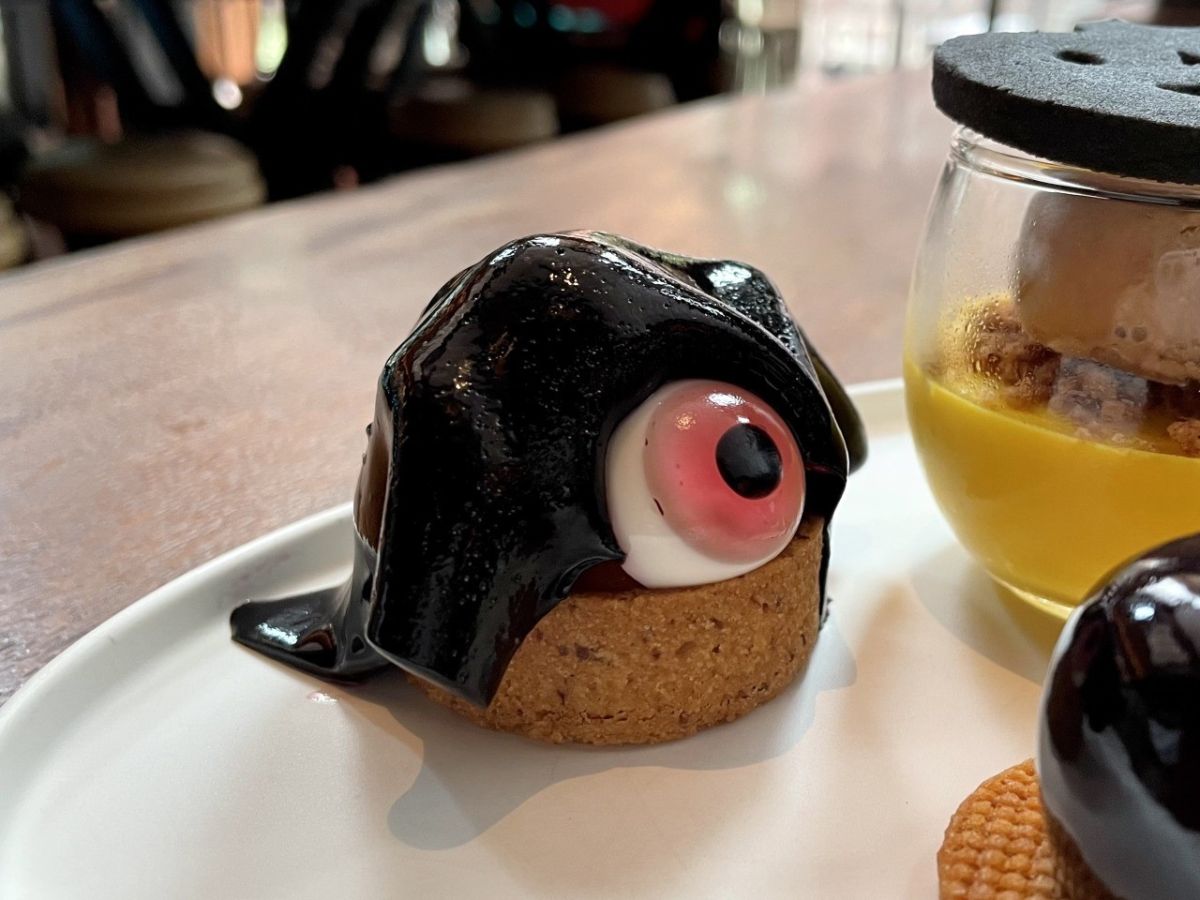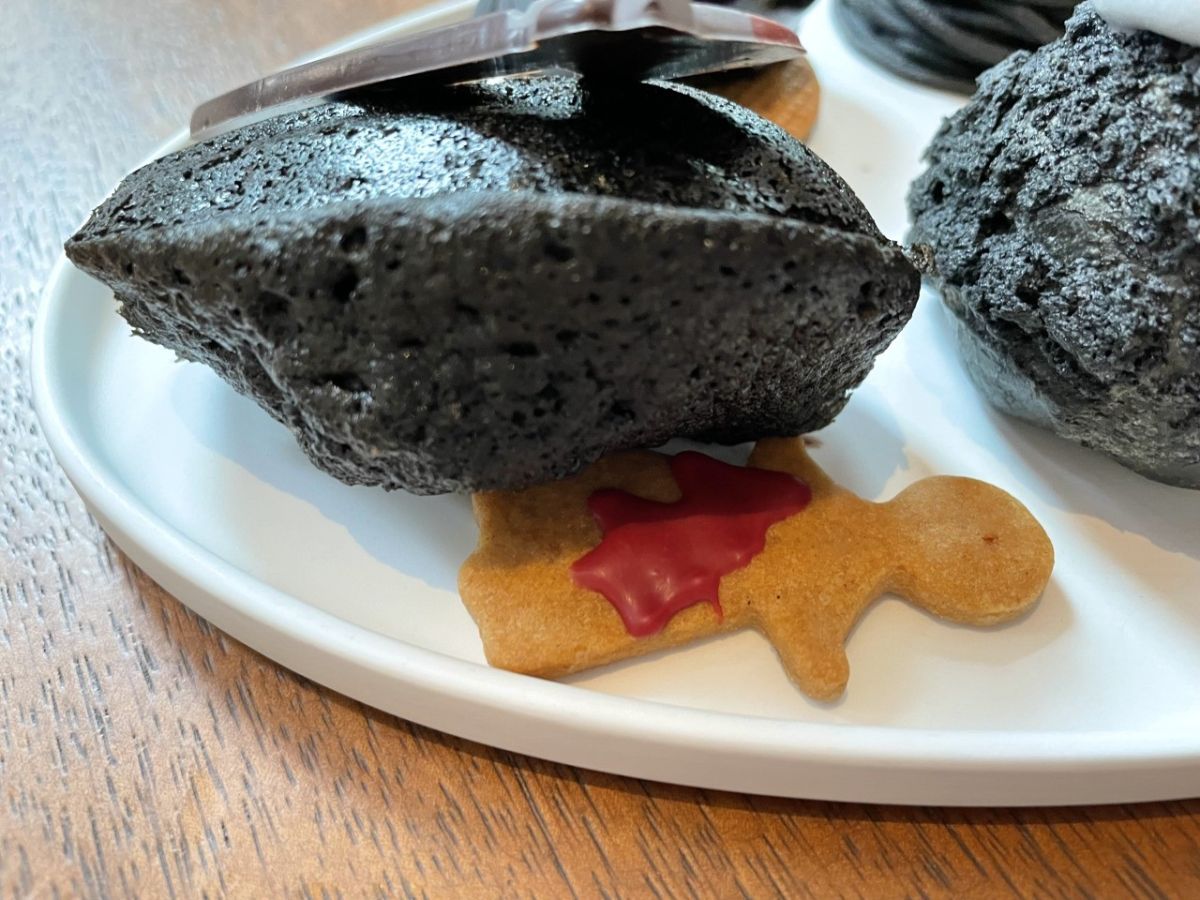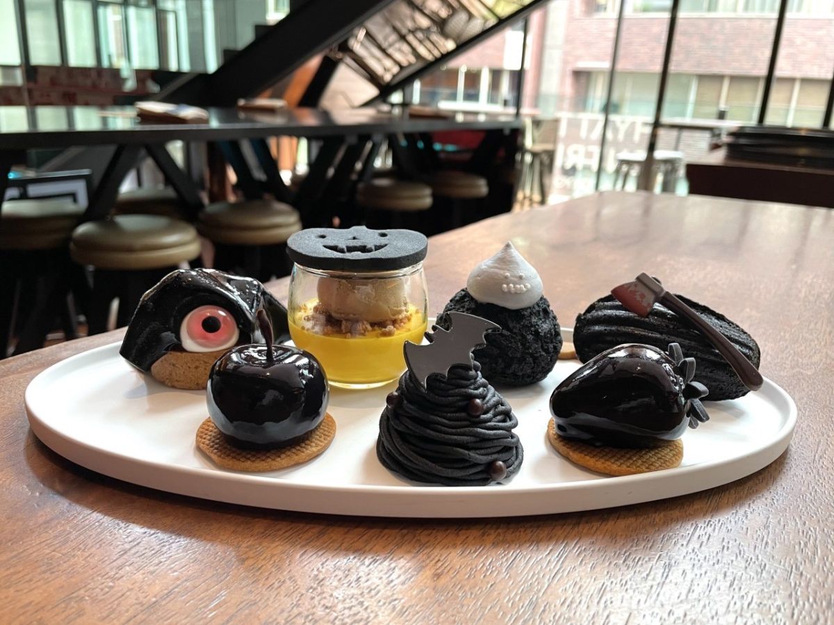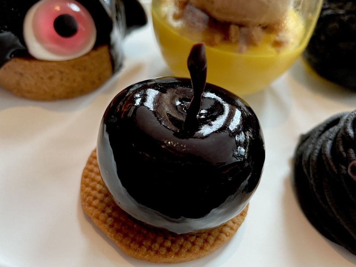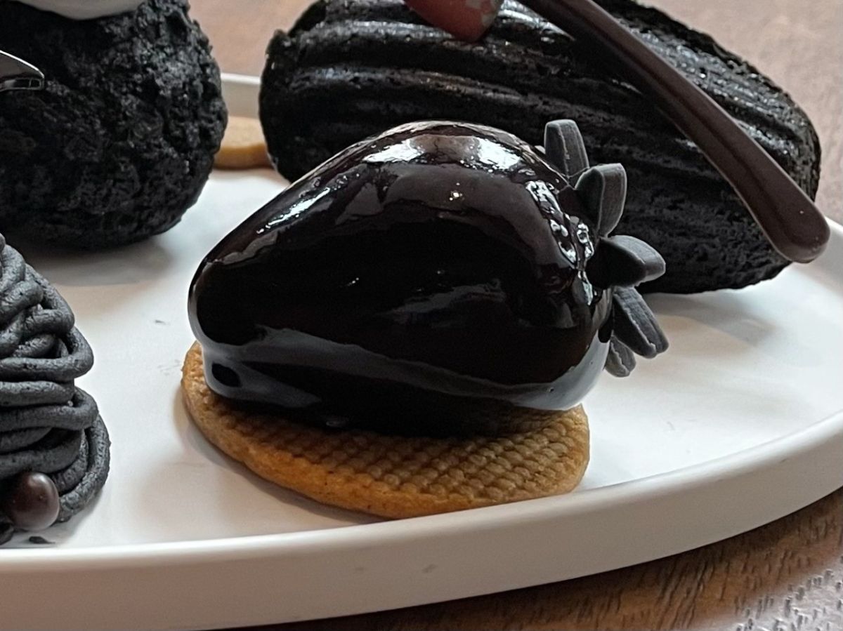 黒で統一されたハロウィン感満載のスイーツをいただきます。こちらは写真奥左から右、さらに写真手前左から右へとご紹介。