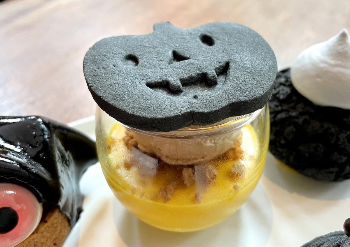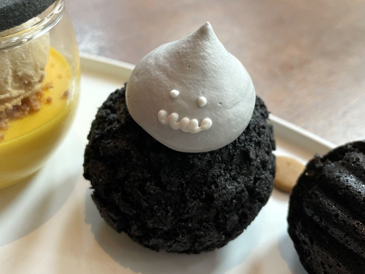 「真っ黒おばけシュークリーム」は、シューの中にかぼちゃのカスタードを詰め、おばけをトッピングした一品。シュー生地と飾りつけのおばけには竹炭を使用しています。おばけに顔が書いてあるのでダークな雰囲気だけではなく、ポップ感もあって可愛らしいですよね。