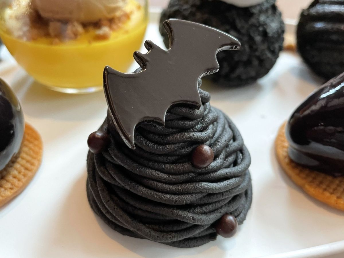 「コウモリモンブラン」は、コウモリ型のチョコレートがかわいいモンブラン。焼き上げたメレンゲに生クリームを絞っています。さらにフランス産のマロンペーストにラム酒を入れることによって、お酒の味を少しだけ利かせていました。