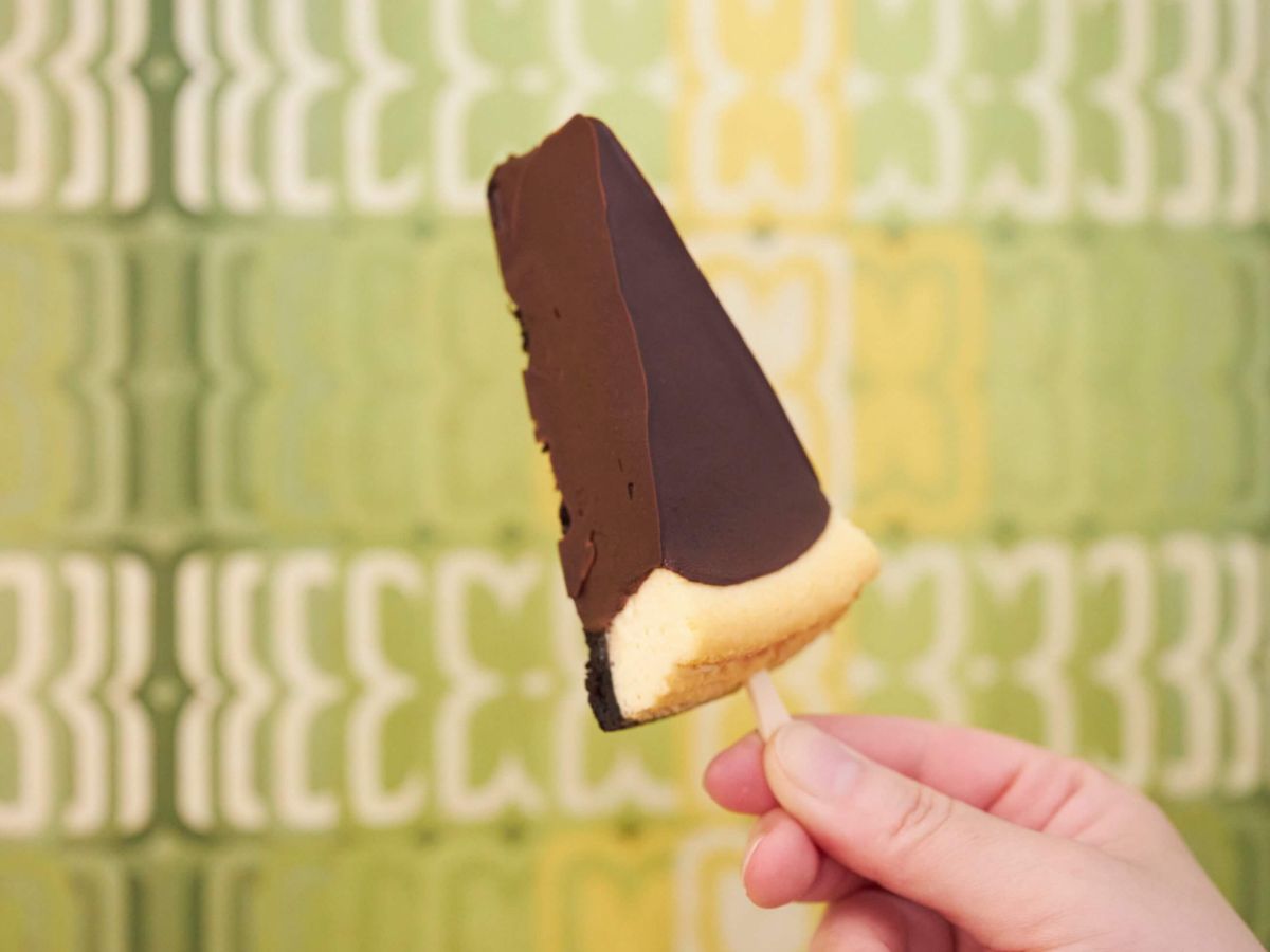お店を訪れたらぜひオーダーしたいのがコチラ。三角形のチョコアイスバー……ではなく、スペシャリテの「チーズケーキバー」です!気軽に食べられるチーズケーキとして、創業時に考案されたオリジナルのチーズケーキなんですよ。