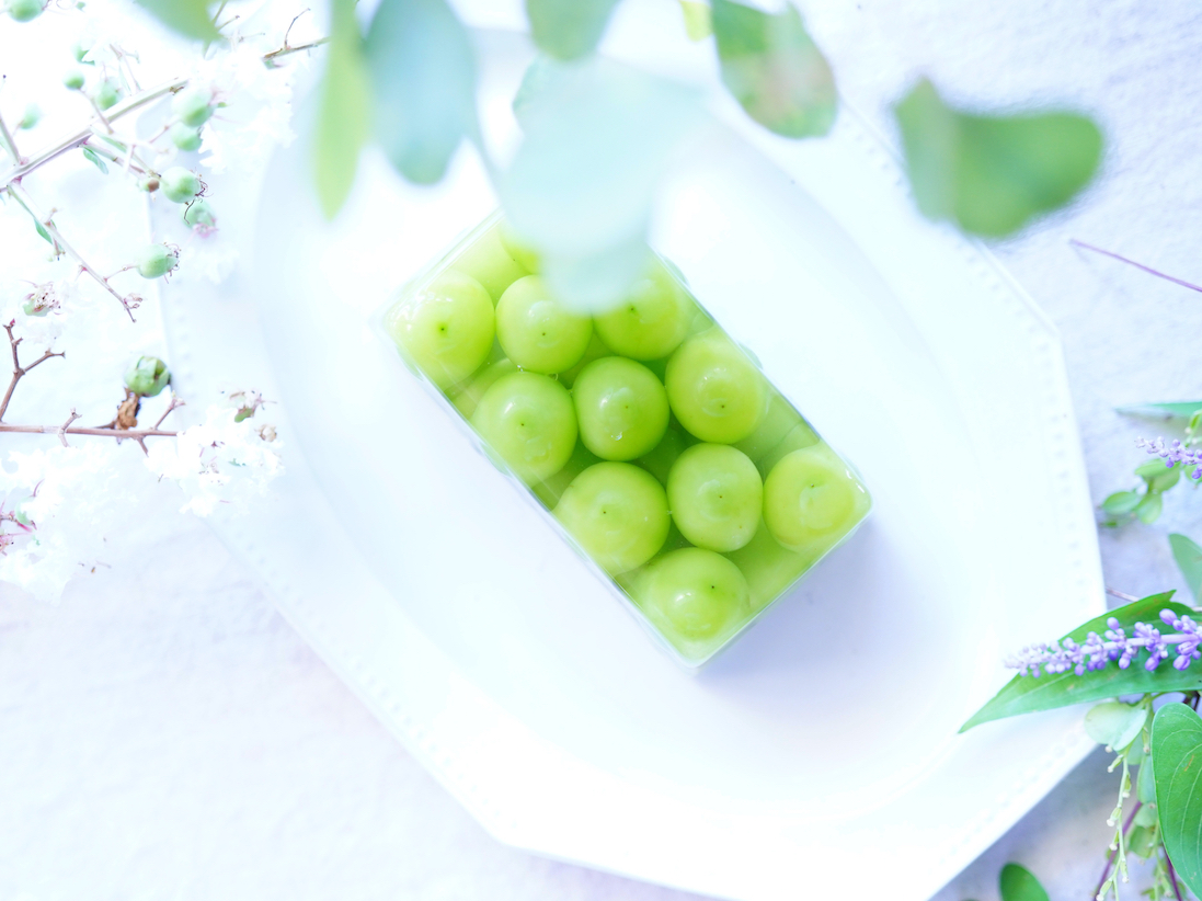 朝晩、だいぶ涼しくなってきて、すっかり秋の気配ですね。お店にも色とりどりのぶどうが並んでいて、わくわく!晩夏から秋が深まるまで、長い間楽しめるぶどうは大好きなフルーツのひとつです。その中でも、シャインマスカットは別格!毎年の楽しみになっています。驚くほど甘く、皮のまま食べられるので、野菜室を開けるたびに、ついつい口に放り込んで…というのを繰り返してしまい、慌てて今回のデザートを作りました!(笑)プリプリの美しい実をぎゅっと閉じ込めた、シャインマスカットの宝石箱、作る工程も楽しく、しかもとても簡単なので、よかったらチャレンジしてみてくださいね!