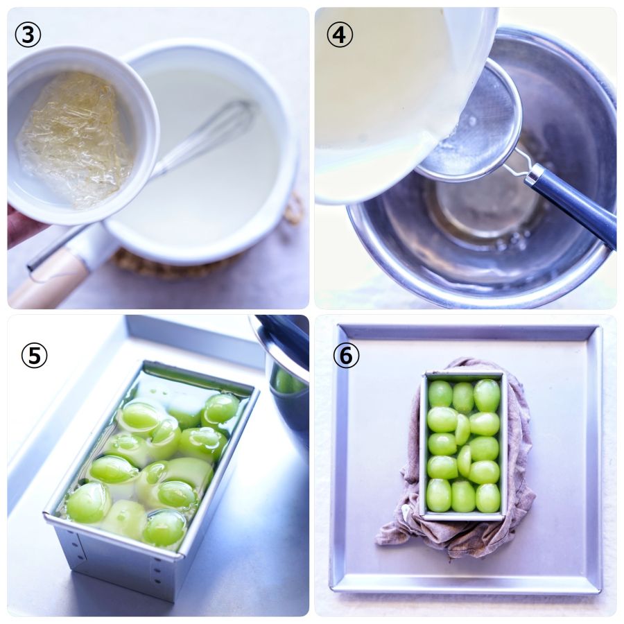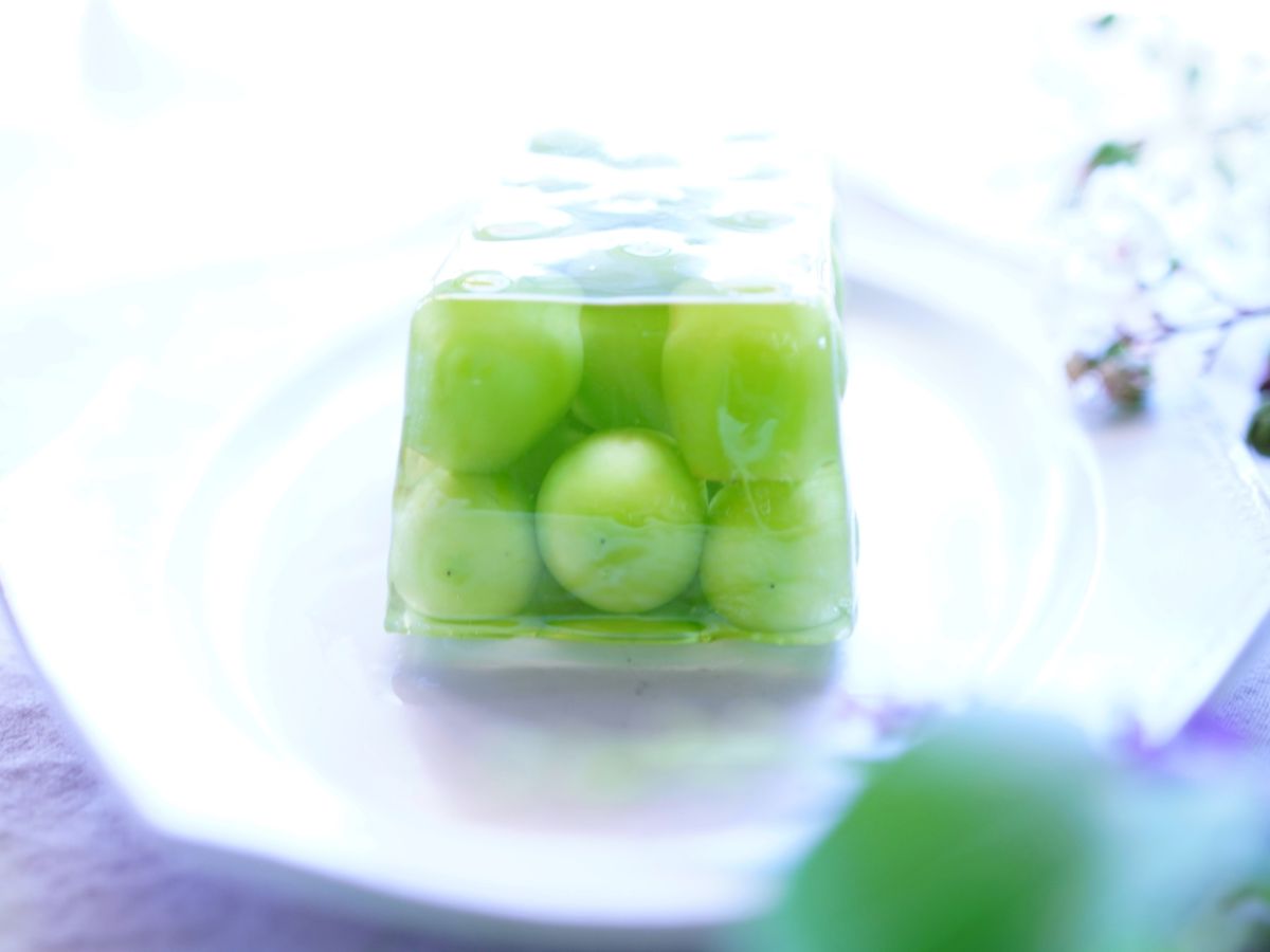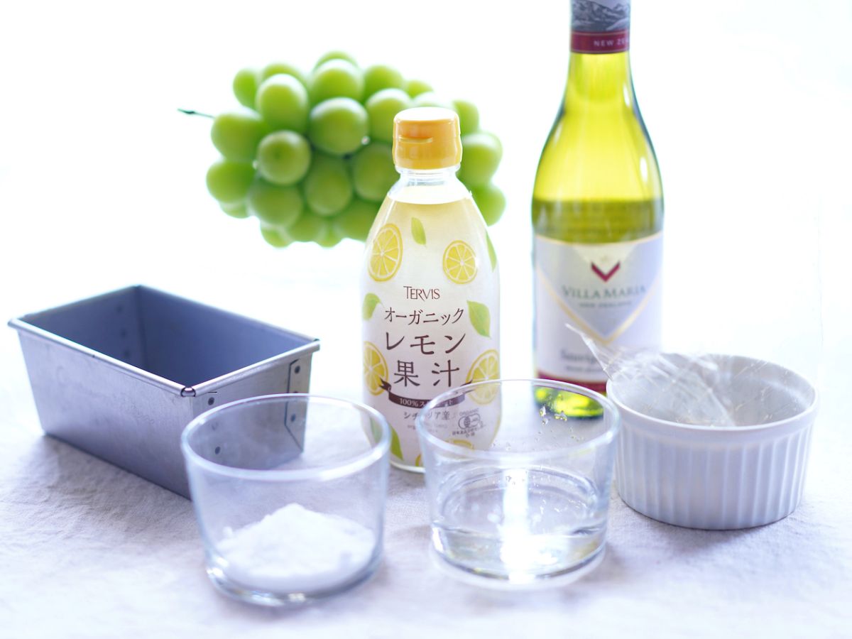 | シャインマスカット…約24粒 水…120g 白ワイン…50g(半量を桃のリキュールなどに変えても) グラニュー糖…45g レモン汁…5g 板ゼラチン…6g |