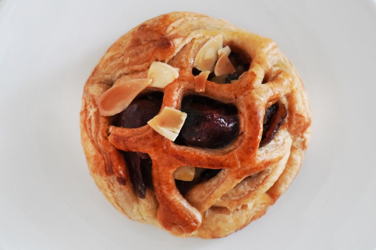 お皿にのせて上から眺めてみると、網の目状のパイはこんがり焼き目が付いてツヤがあり、その間から濃い茶色い栗が見えます。アーモンドスライスもトッピングされ、おいしそうですね。
