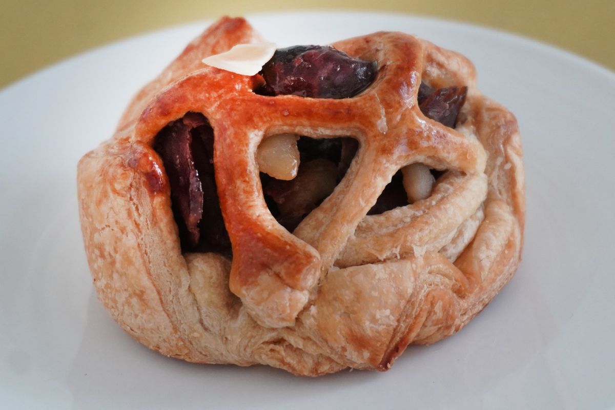 直径は約8㎝。重量感があります。形がちょっといびつで、パイ生地の層になった部分も見え、手作り感のあるビジュアルです。