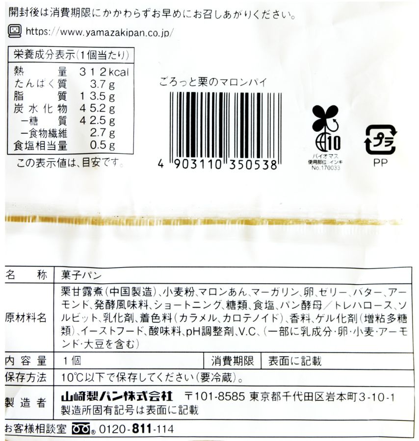 パイ生地はバターが香り、しっとりとした食感。中に入っている渋皮栗の甘露煮は、ねっとりとやわらかく上品な甘みで、下の栗あんと一体感があり、塩気のあるパイ生地と好相性。栗の風味で口の中が満たされます。気になるカロリーは312kcal。パンやケーキ1個分という程度ですが、食べごたえは十分です。