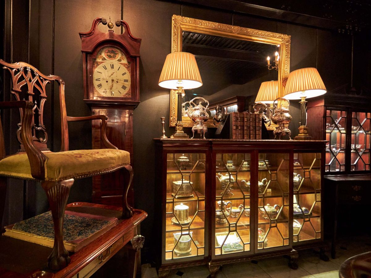 ここは1714~1837年のジョージ王朝時代を再現したフロアです。壁一面のディスプレイキャビネットには、ティーポット、ビスケットウォーマー、ティーケトルなど、当時の華やかな暮らしを感じられる美しいシルバーウェア(銀器)が並びます。