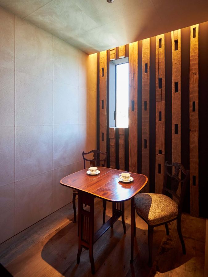 ラストは、「ヴィクトリアルーム」の一角に造られた、隈研吾氏デザインの茶室をご紹介します。壁や床に使用している木材は、「BAM鎌倉」の建築に際し、この土地の発掘調査で出土した古い木材。そこに12世紀から続く英国のホテルで使われていたオークの床材を合わせて、日本と英国の伝統文化を融合させた茶室に仕上げています。