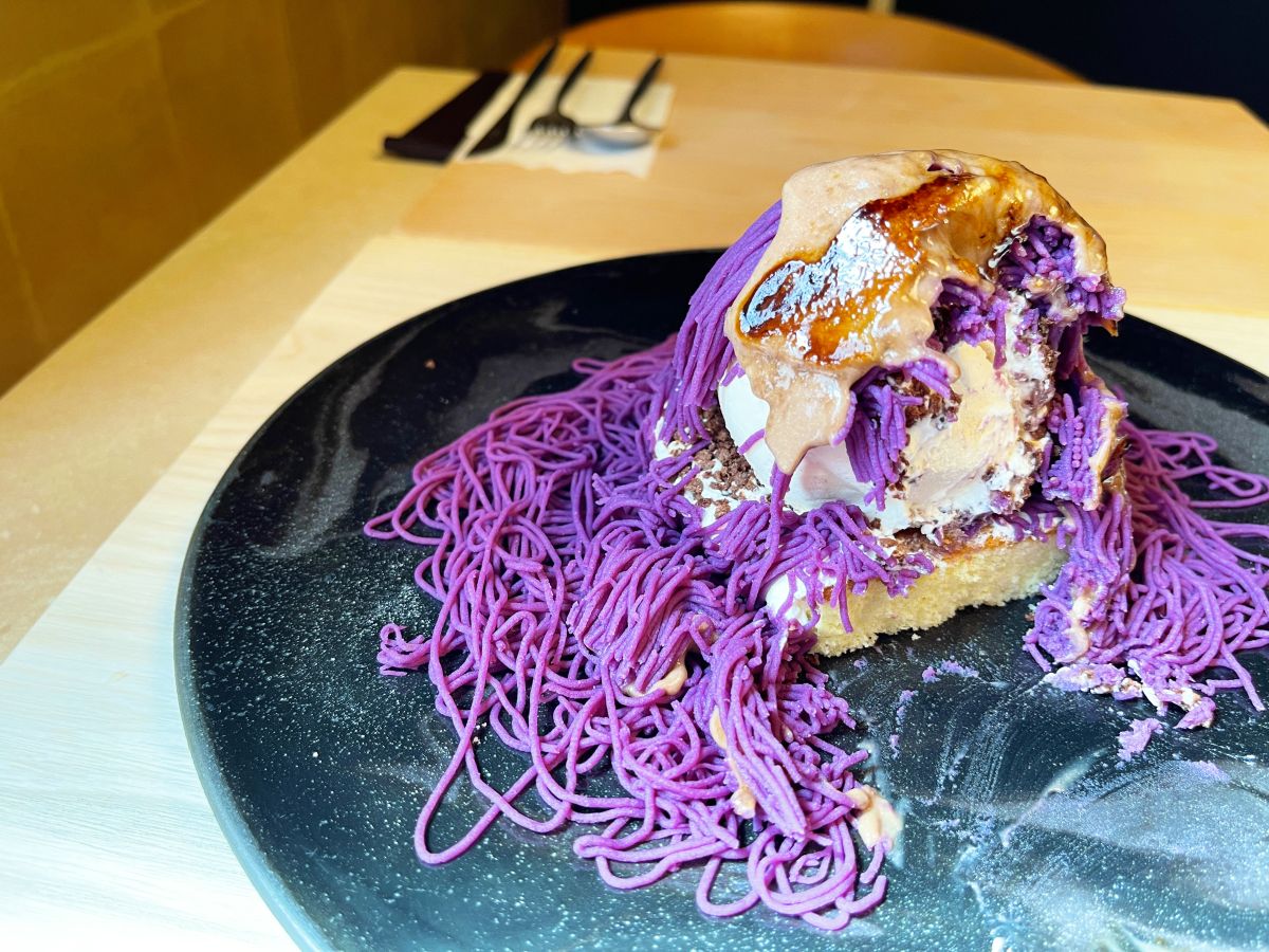 色鮮やかな紫芋がパッと目を引く、“お芋のお山”のようなモンブラン。ワクワクする見た目と、お芋の濃厚さ&ブリュレのパリパリ食感が楽しい♪ フルーティーな甘さの綾紫芋を1mmの細さで仕上げているので、香りと舌触りがふんわりしているんです! しっとりなめらかで、お芋の甘みや濃厚さも堪能できますよ。