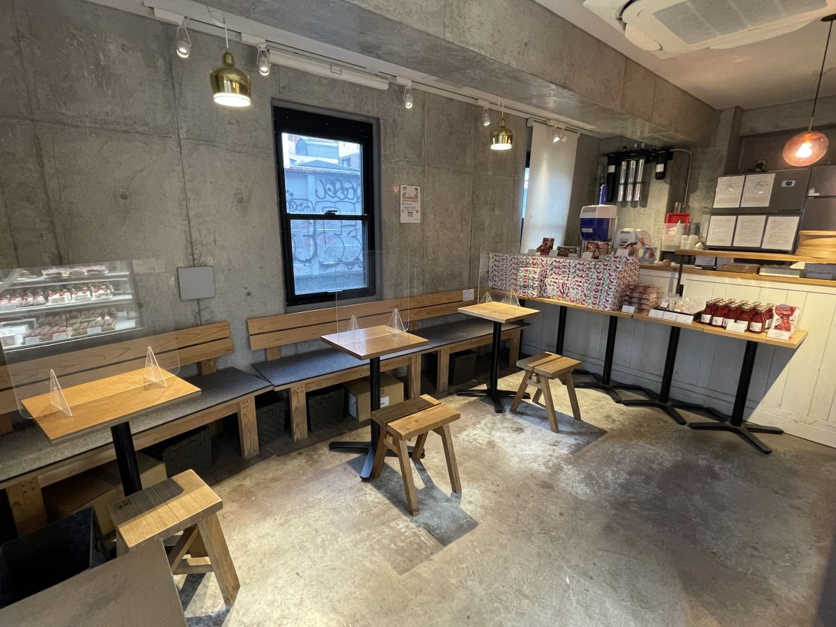 店内にはイートインの席が6席ほど(新型コロナウイルス感染症対策で減席中)。打ちっぱなしのコンクリートやレトロなシーリングライトがとってもおしゃれ♪