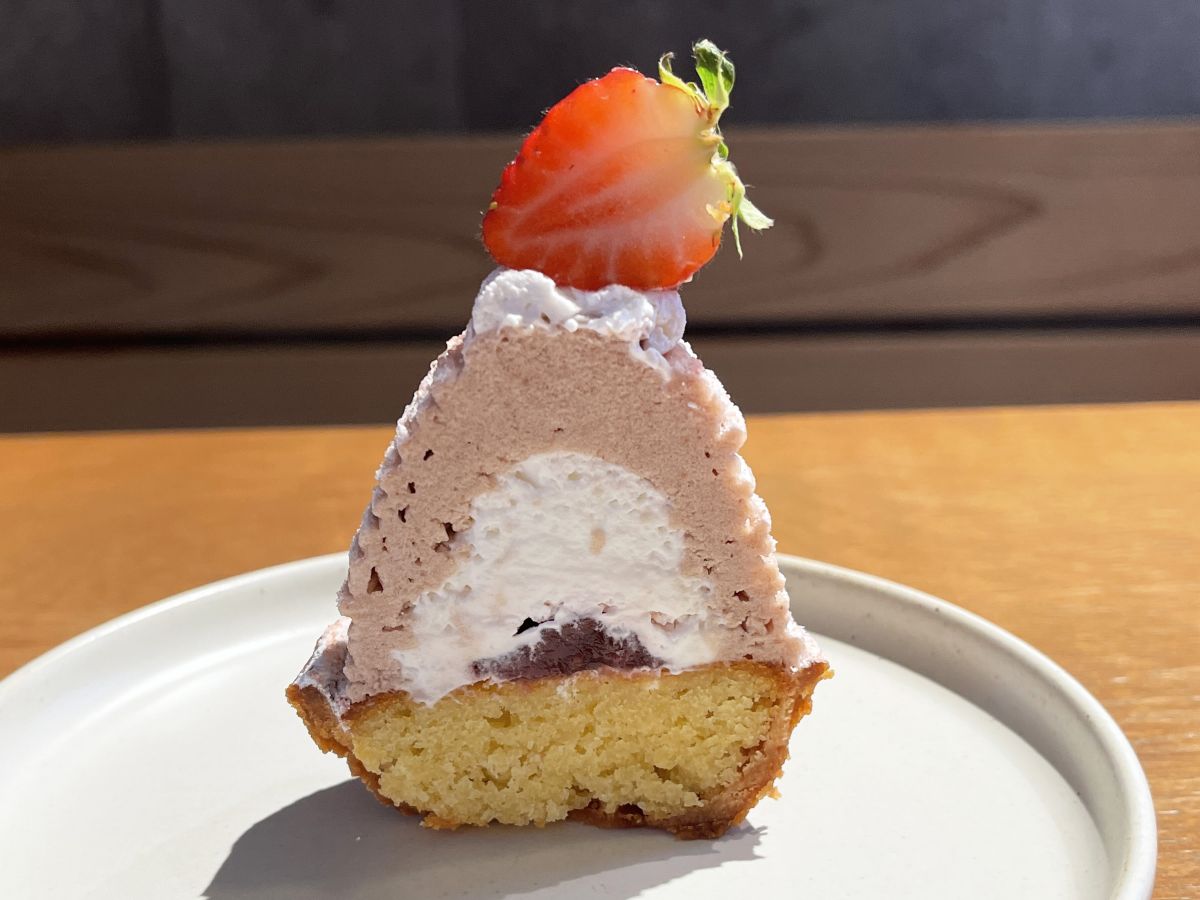 モンブランフレーズの中身はムースショコラブラン、ムースマロン、コンフィフレーズ、シュトレーゼアーモンドの4層仕立て。いちごのコンフィチュールがマロンムースに甘酸っぱいアクセントを加えてくれます。