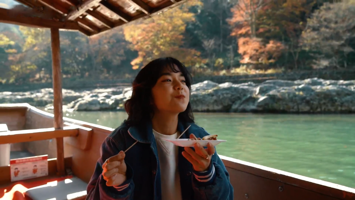 京都・嵐山ひとり旅のスタートは、雄大な自然を眺めながらの屋形船から。渡月橋の上流一帯、船頭が竿一本で案内してくれる遊覧船は、898年頃(平安時代)に醍醐天皇が“船遊び”をしたことが始まりといわれています。小さな屋形船なので、水面までの距離が近いのが魅力的。四季折々で美しい景色を楽しめるゆったりとした船旅は、日常の疲れやあわただしさを忘れさせてくれそうです。船旅を楽しんでいると、向こう側からお食事やスイーツを乗せた船が。メイさんは、みたらし団子といか焼きを購入し、船上で味わいます。嵐山通船では、船内で食事やスイーツが楽しめるプランも。おひとりさまでも複数人でも、大満足の遊覧が楽しめます♪ ご利用の際は予約がおすすめ。