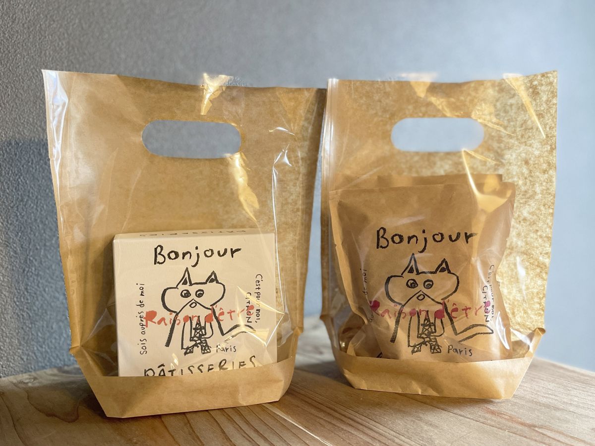 お店はパリの街角にあるお菓子屋さんをイメージしていて、おしゃれな雰囲気。窓に描かれた猫のキャラクターは、姫路にある本店の看板猫だった「ひじきちゃん」をモデルにしているのだそう。