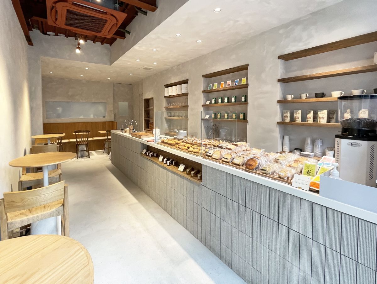 お店は、グレーとオフホワイトの壁のシンプルな外観で、ガラス張りのエントランスからは陽の光が差し込み、明るく開放的。壁にはお店のロゴマークが飾られていて、スタイリッシュながらもどこかかわいらしい雰囲気に癒やされます。